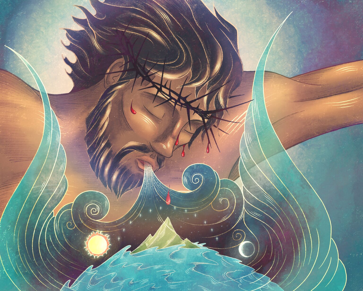 Yes, the flesh of the Son—proven to be truly flesh in the moment of His death when He breathes down His own spirit—the flesh of the Son is the “mouth” by which the Breath of God is ex-spirated into the lungs of lifeless Creation. The incarnate body of Christ is, as it were, the “lips” of the Creator, set in love to those of the Bridal Cosmos (the Cosmos, one might say, whose “lips” are humanity) from Beginning. These are the “lips” parted in the exhalation of Calvary, through which is breathed down from the cross the same Spirit who hovers over the waters in Genesis 1.